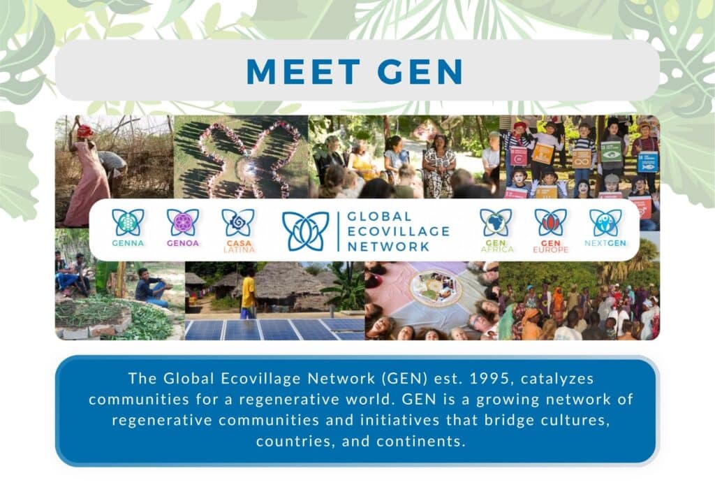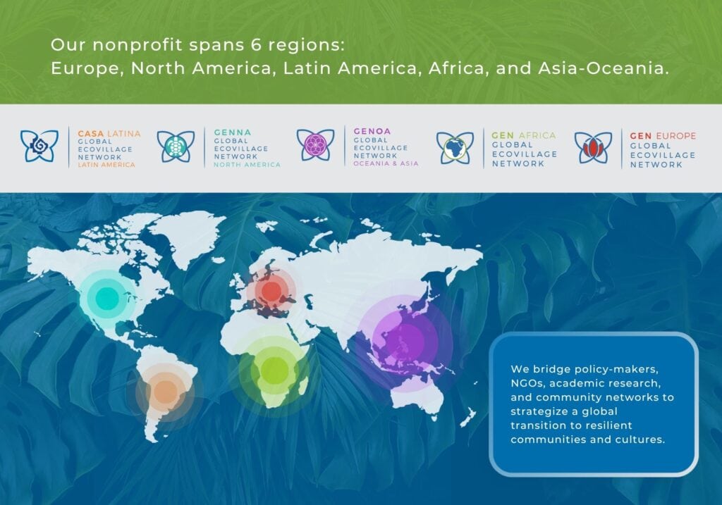 - If you already have an ecovillage project, become active in our regional network and enroll in the GEN ECOVILLAGE MAP DATABASE