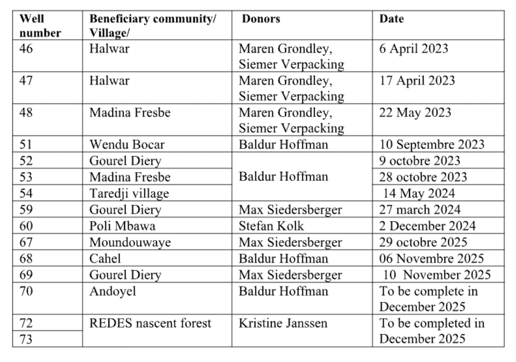 - Maren Grondey and Siemer Verpackung for its precious support in building education infrastructure and life sustaining wells. This contributes to improves the current living standards of the beneficiaries while helping create a path into a better future for them.